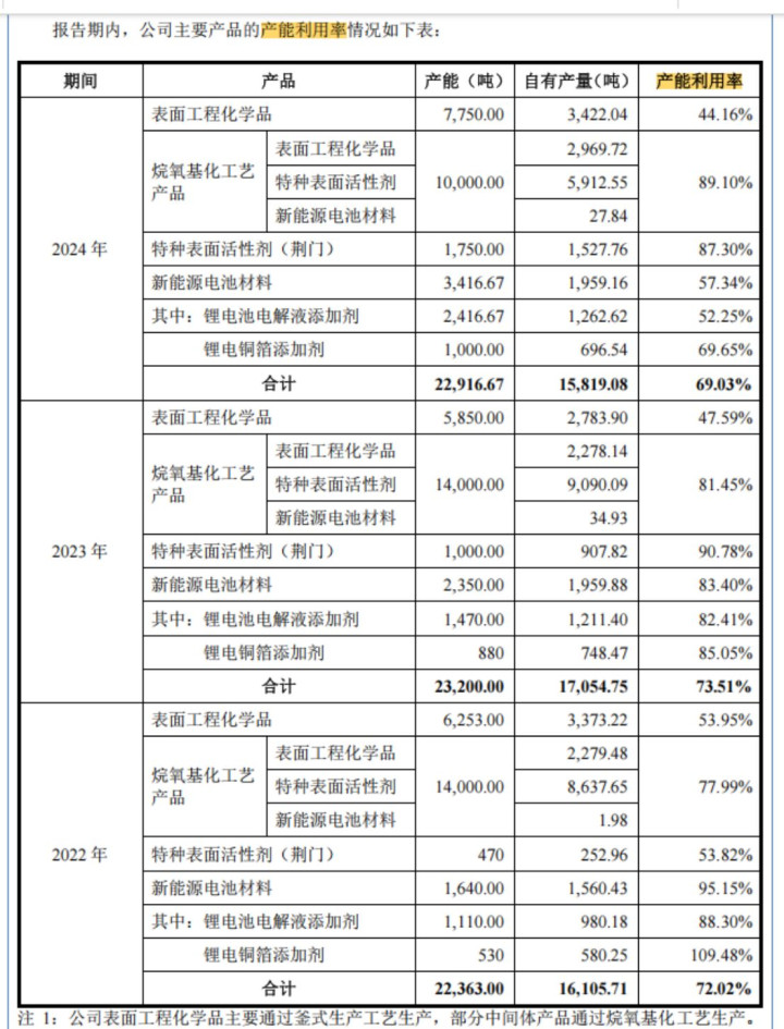 近两年,吉和昌锂电铜箔添加剂相关产能利用率持续下降,2024年公司现有1000吨锂电铜箔添加剂产能的利用率仅为69.65%。这意味着新增产能相当于现有产能的71%,在当前行业需求疲软的背景下,其市场消化能力存疑。