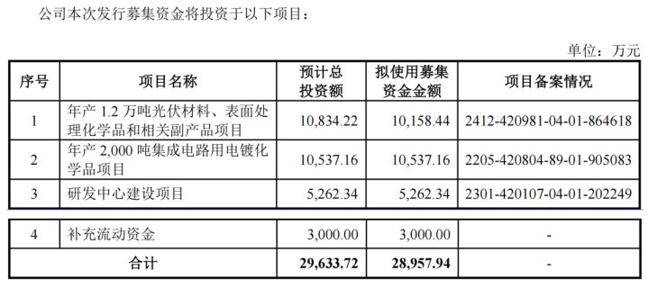 另外一大募投项目即年产1.2万吨光伏材料、表面处理化学品和相关副产品项目拟使用募资金额1.02亿元,重点提升公司水性新材料产品及表面工程化学品生产规模。