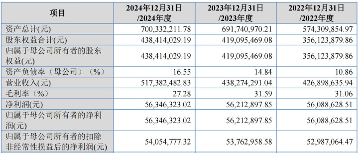 报告期内,吉和昌营收稳步增长,分别为4.27亿元、4.38亿元及5.17亿元;但净利润增长缓慢,分别为5608.86万元、5621.29万元及5634.63万元,三年累计增幅仅0.46%。